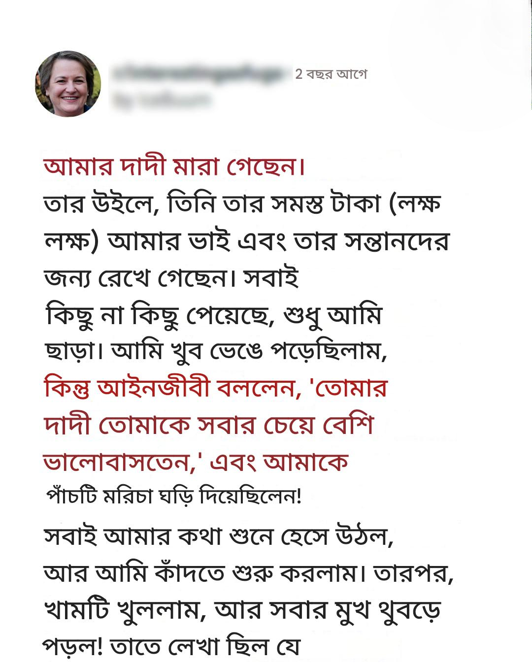 ব্রায়ান এবং লিন্ডা তাদের ৯০ বছর বয়সী দিদিমা মার্লিনের সাথে দেখা করতে এসেছিলেন। তিনি তাদের জরুরিভাবে তাকে দেখার জন্য অনুরোধ করেছিলেন। “প্রিয়তমা, আমি তোমাদের শেষবারের মতো দেখতে চাই। আমি হয়তো আর কখনও সুযোগ পাব না,” মারলিন দুদিন আগে ফোনে তাদের যন্ত্রণার সাথে বলেছিলেন… লিন্ডা যখন তার দিদিমার শোবার ঘরে ঢুকল, তখন সে কাশি দিল, লক্ষ্য করল যে ধুলোবালিতে ঢাকা। মারলিন অনেক বৃদ্ধ এবং অসুস্থ ছিল, একা একা কাজ করার জন্য। সে মেঝে ঝাড়ু দেয়নি, এবং লিন্ডা দেখল যে ফুটো হওয়ার কারণে ছাদটি ছাঁচে পড়েছে। “দিদিমা!!” সে দৌড়ে গিয়ে বিছানায় থাকা মার্লিনকে জড়িয়ে ধরল। “দিদিমা, তোমার কিছু হবে না। দয়া করে চিন্তা করো না। ঈশ্বর তোমাকে আমাদের কাছ থেকে কেড়ে নেবেন না কারণ তুমিই আমাদের সবকিছু।”