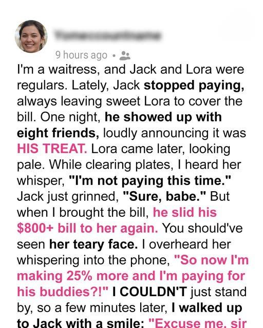 But lately? Jack swaggered in like he owned the place, ordering the finest steaks, rare wines, and appetizers for everyone—while Lora quietly paid for it all.