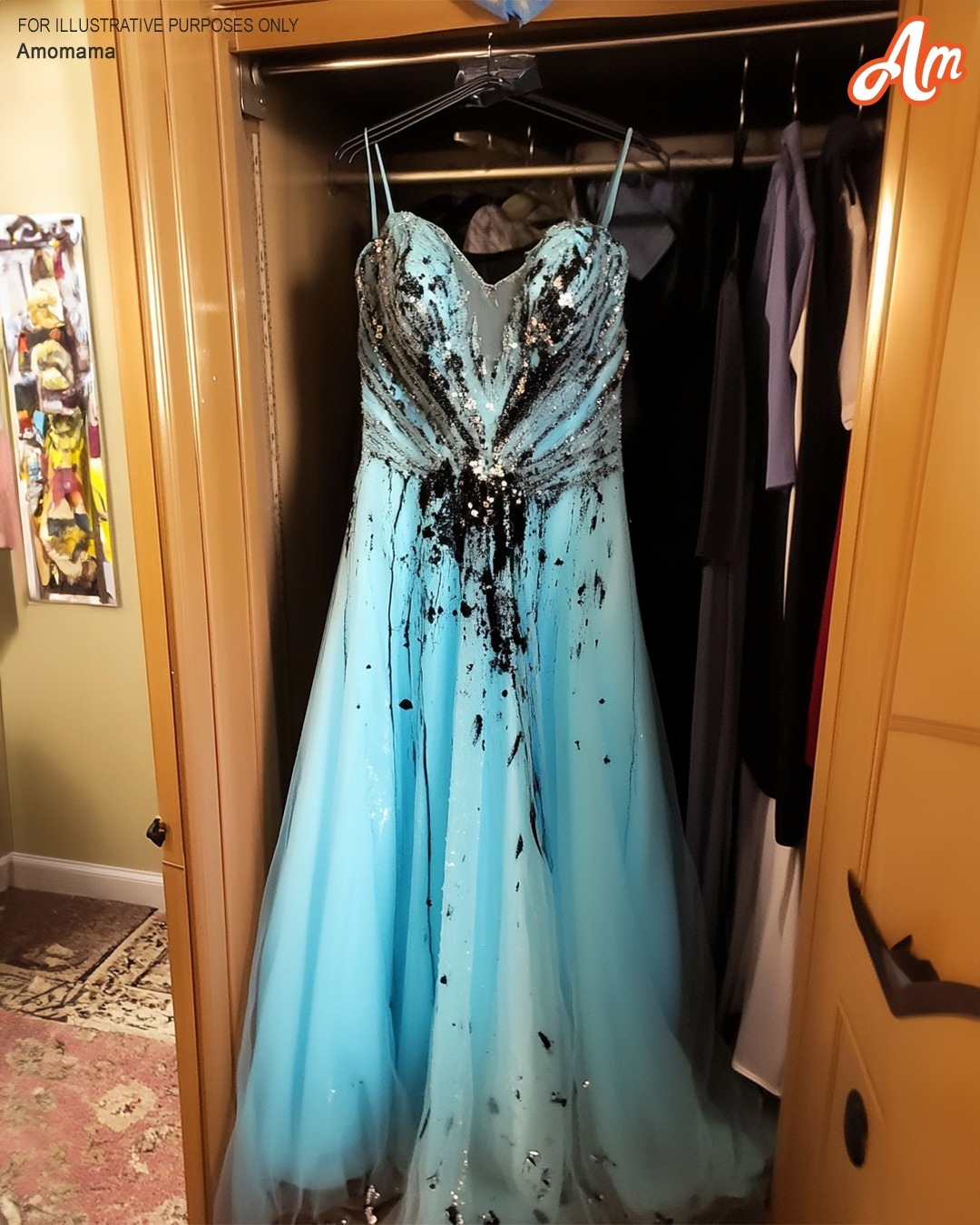 My lovely baby blue gown was ruined. Thick streaks of black paint covered the fabric as it was sprayed all over. I merely stood there, motionless. What I was seeing was too much for my mind to handle. My eyes filled with tears. “What… how…?” I muttered. I caressed the torn fabric with trembling hands. It could not be fixed. In a moment, what I had been dreaming about for months was gone. My ideal outfit. My ideal evening. Tears were running down my face as I ran downstairs. “Carol!” I let out a cry. Carol, my dress was destroyed by someone! It’s—it’s covered with paint!”