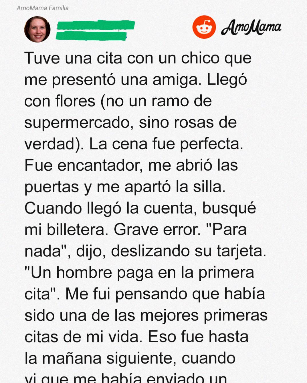 Cuando Eric insistió en pagar en nuestra primera cita, pensé que había conocido a un verdadero caballero. Rosas, un regalo dulce, una conversación encantadora… cumplía todos los requisitos. Cuando me envió un mensaje de texto al día siguiente, esperaba una bonita continuación, hasta que leí su mensaje.