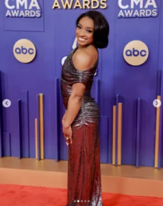 That evening, the 27-year-old Olympian stepped onto the red carpet in a shimmering metallic gown that highlighted her elegance and confidence. The silver dress, featuring a knotted shoulder strap and an off-the-shoulder sleeve, hugged her athletic frame. She completed the look with stud earrings and a delicate hand chain that highlighted her wedding ring. Simone also stepped into the spotlight as one of the evening’s presenters. She joined an impressive roster of celebrities, including Jeff Bridges, Carly Pearce, and Little Big Town, to celebrate the best in country music.